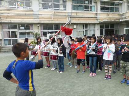 日曜日に迫った幕末維新祭りに向けて、5、6年生が鼓笛パレードの練習をしました。