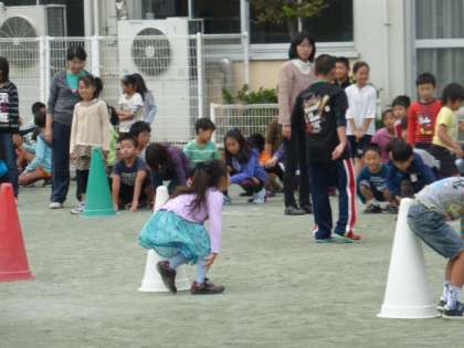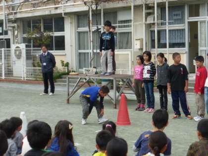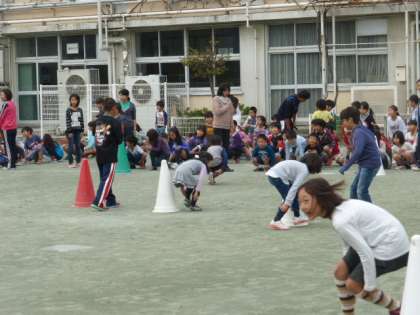 集会委員さんが考えてくれた「足つかみリレー」に、みんなで取り組みました。