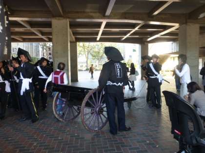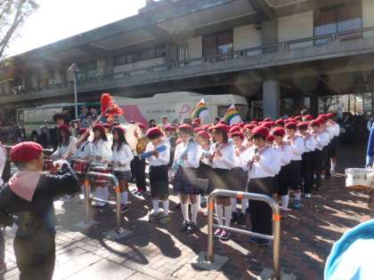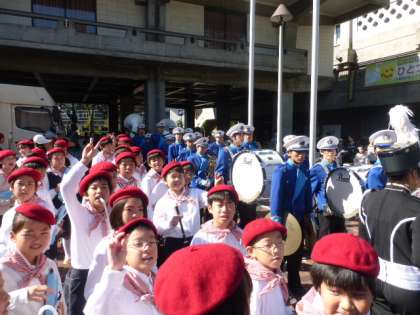 集合場所である世田谷区役所で、国士舘大学吹奏楽部と、奇兵隊に合流しました。