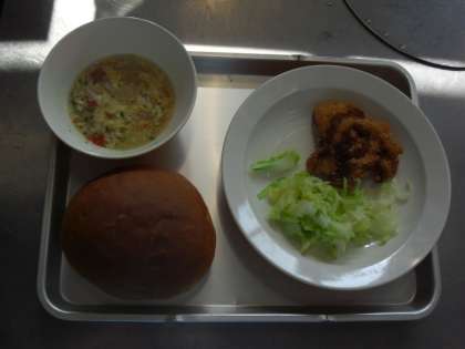 主な食材の産地 ミルクパン(アメリカ・カナダ)メルルーサ(ニュージーランド)鶏卵(群馬)鶏もも肉(宮崎)きゃべつ(群馬)たまねぎ(北海道)トマト(愛知)にんじん(北海道)パセリ(長野)