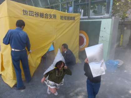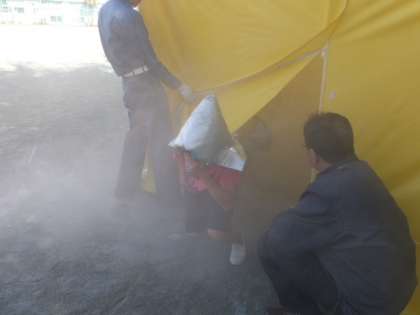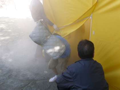 テントの中は煙でいっぱい(訓練のため無害な煙を使用しています)。