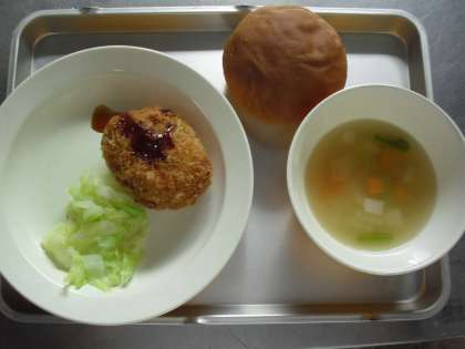 献立名 丸パン 牛乳 コロッケ ゆでキャベツ 野菜スープ