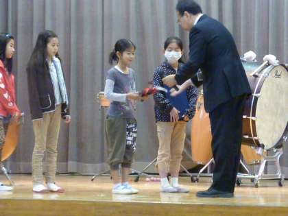 「笑in若林」が、町田市で行われた大会で入賞したため、朝会の中で表彰が行われました。