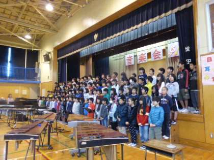 今朝の音楽朝会では、音楽会で歌う全校合唱の練習が行われました。