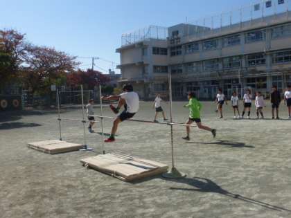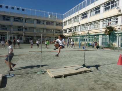 5年生が体育で走り高跳びと走り幅跳びに挑戦しました。