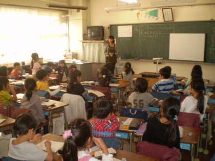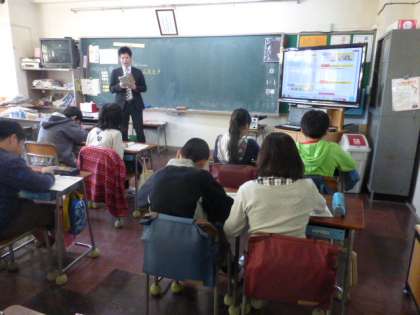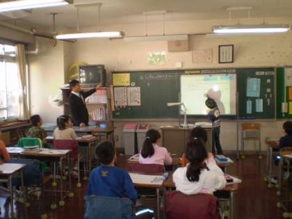 5年生の教室では世田谷中学校の先生が来て、英語の学習を手伝ってくれていました。