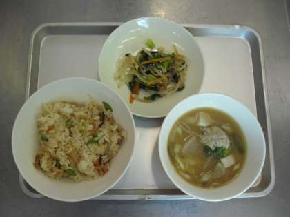 主な食材の産地 米(広島)鳥もも肉(岩手)とびうおすり身(東京)油揚げ(カナダ)糸こんにゃく(群馬)干しいたけ(宮崎)にんじん(千葉)さやいんげん(千葉)しょうが(高知)ねぎ(茨城)ごぼう(青森)だいこん(千葉)さといも(埼玉)白菜(茨城)もやし(栃木)こまつな(埼玉)