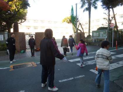 安全確保のために先生たちが通学路に出て、子ども達の安全指導をしています。