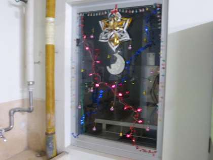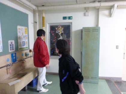 放課後の給食室前で、主事さんたちが何やら作業をしています。