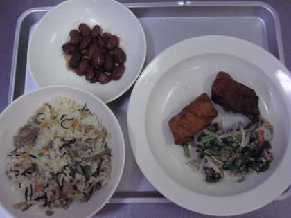 献立名 五目ごはん 牛乳 いかのかりんとあげ 煮豆 野菜のごまみそかけ