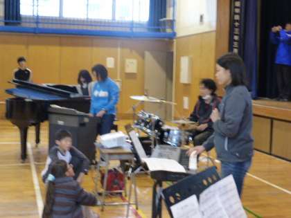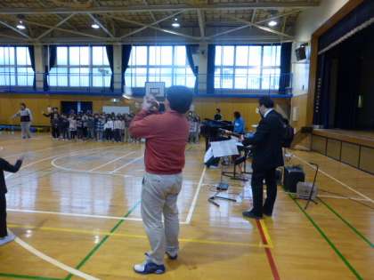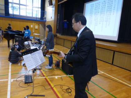 今回の音楽朝会は特別に先生たちのバンドによる伴奏です。