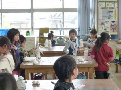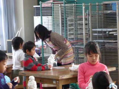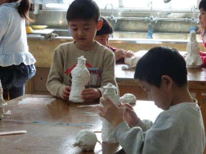まっ白い紙粘土とペットボトルでお人形にしていきます。