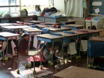 1年生も初めてに経験に驚いたようですが、すぐに机の下に避難しました。