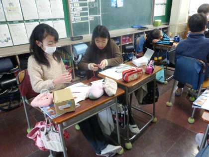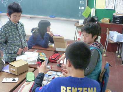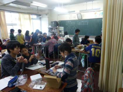 手回し式の発電機でコンデンサに電気を貯め、LEDを点灯させます。