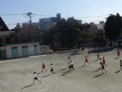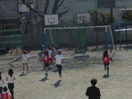 6年生が校庭で元気いっぱいにサッカーをしていました。