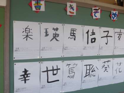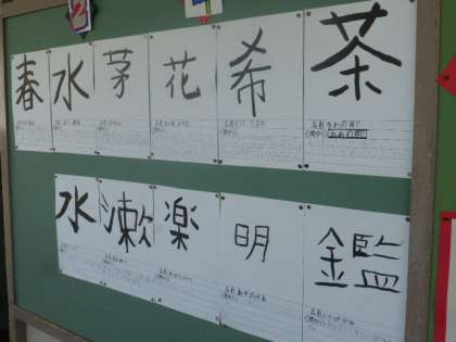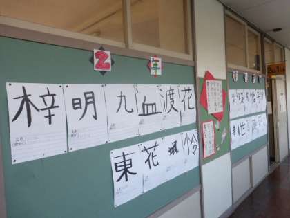 2年生の教室前には、先日の日本語の学習で取り組んだ毛筆作品が掲示されています。