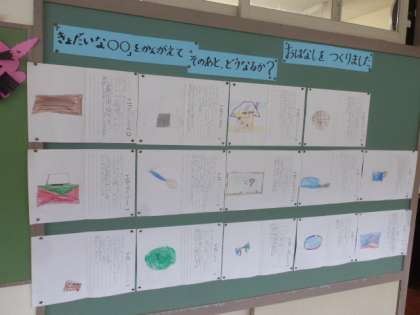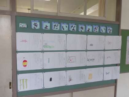 1年生の教室の前には、国語で学習した絵本についての作品が展示されています。