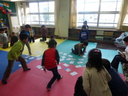 3年生手作りのジャンボかるたに、思わず横っとびです!