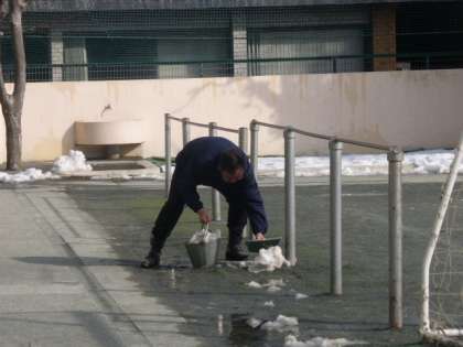 休み時間に校長先生がひとりでせっせと除雪をしていました。
