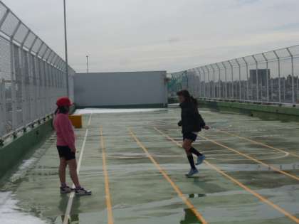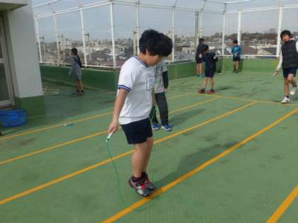 5年生は校庭が使えないため、校舎の屋上でなわとびをしていました。