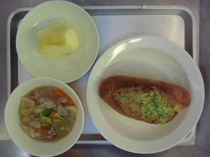 献立名 ソフトフランスパン(アメリカ・カナダ)にんにく(青森)パセリ(千葉)にんじん(千葉)たまねぎ(北海道)ジャガイモ(北海道)きゃべつ(愛知)さやいんげん(沖縄)リンゴ(青森)ベーコン(神奈川)豚肩肉(埼玉)白いんげん(北海道)