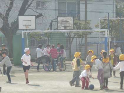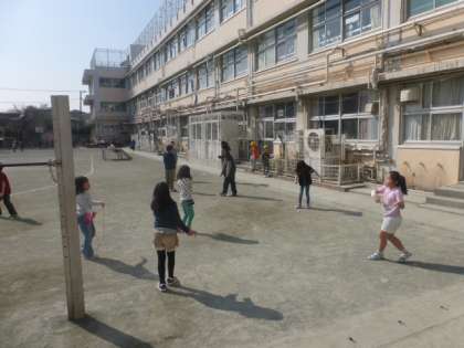 春のような校庭でたくさんの子たちが遊んでいます。