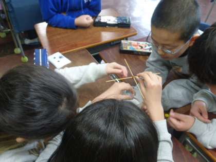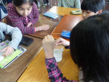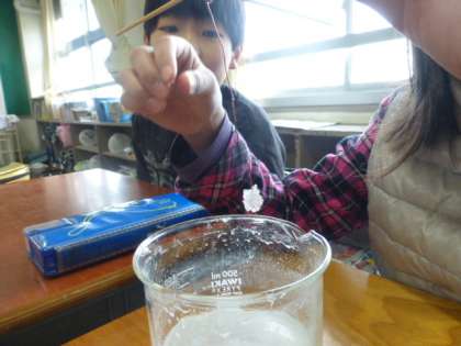 5年生が理科の学習でミョウバンの結晶を育てています。