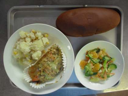 献立名 黒砂糖パン 牛乳 鮭のマヨネーズ焼き コーンポテト フレンチサラダ