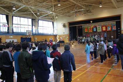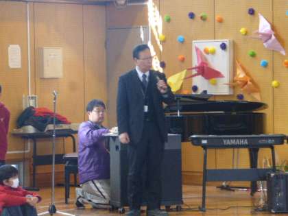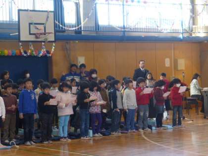 はじめに校長先生のお話、次いで全校合唱がありました。
