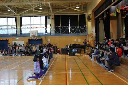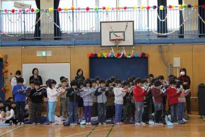 2年生は「オーラリー」の演奏と「世界中のこどもたちが」の歌をプレゼント。