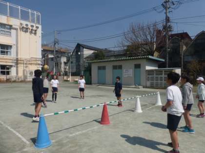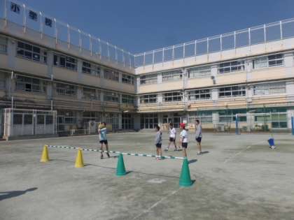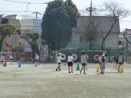 ポジションを考えながら、慣れないスポーツに親しんだ5年生でした。