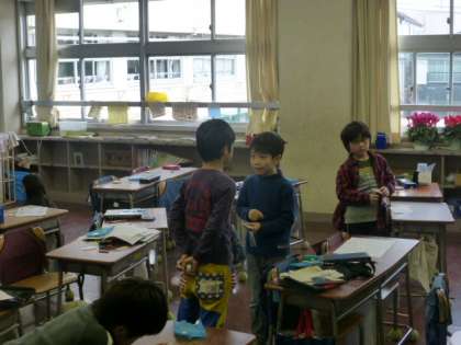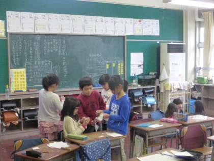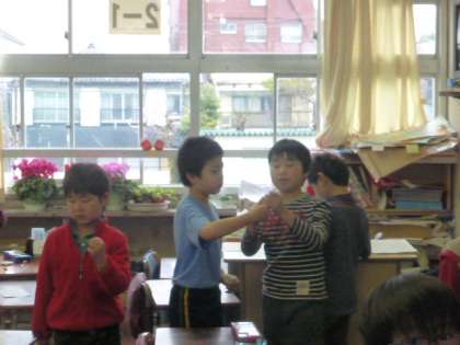 2年生が算数の時間に九九カードを使った九九勝負をしていました。