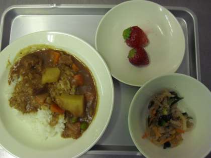 献立名 カレーライス 牛乳 福神漬 わかめサラダ いちご