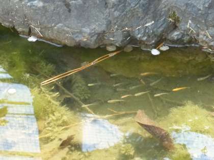 若小名物の開校100周年池で、メダカたちが元気に泳いでいます。