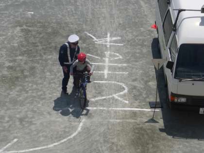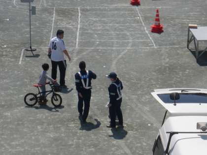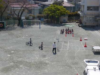 手際良く準備するお巡りさんの手によって、校庭に横断歩道と信号機が出現。