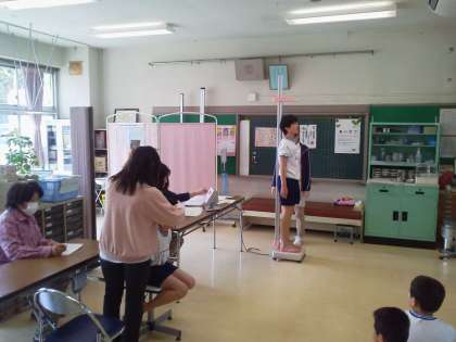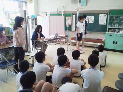 全学年の児童が順番に保健室にやってきて身長と体重、座高を測ります。