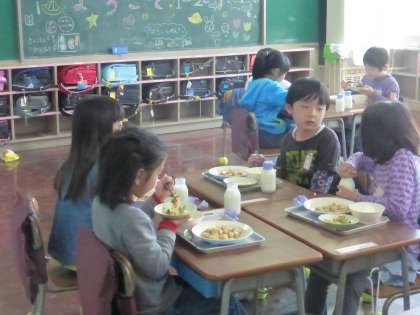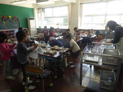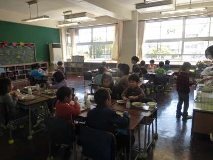 1年生が今日、初めての給食に挑戦しました。