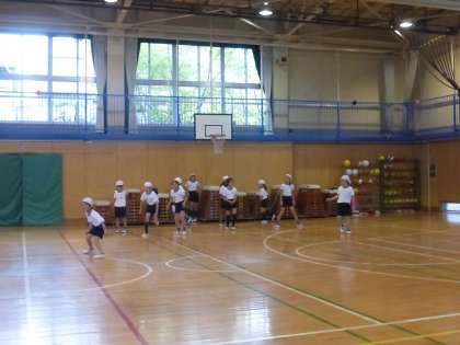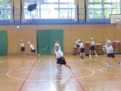 4年生が体育前のウォーミングアップに鬼ごっこをしていました。