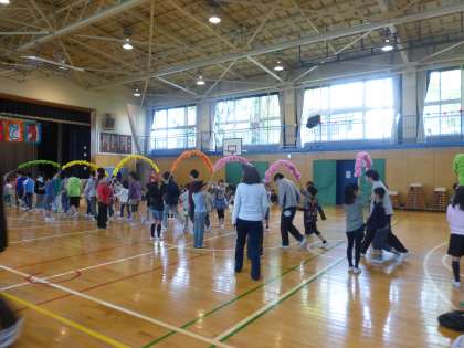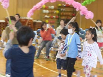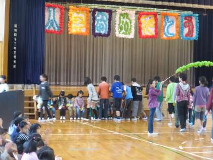 大勢が見守る中、6年生と手をつないだ1年生が入場してきます。