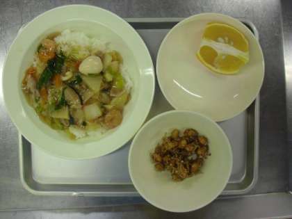献立名 中華丼 牛乳 大豆とじゃこの甘辛揚げ 甘夏みかん