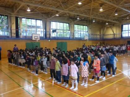今日から1年生も参加して、いよいよ全校児童が揃った朝会です。