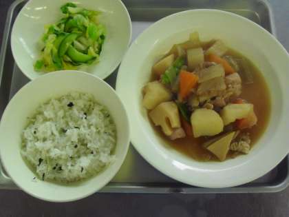主な食材の産地 米(秋田)こんにゃく(群馬)生揚げ(富山・滋賀)にんじん(徳島)じゃがいも(北海道)新たけのこ(静岡)たまねぎ(北海道)ふき(愛知)さやえんどう(千葉)きゃべつ(神奈川)きゅうり(埼玉)しょうが(高知)鶏もも肉(宮崎)