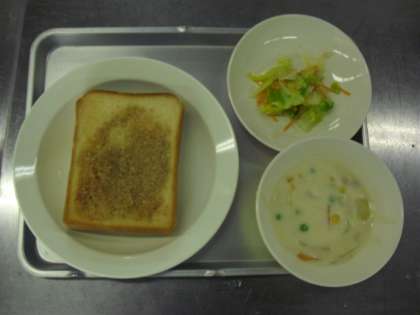 献立名 セサミトースト 牛乳 コーンシチュー キャベツサラダ