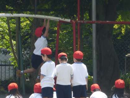 校庭で暖かい日差しをいっぱいに浴び、うんていに挑んでいていました。