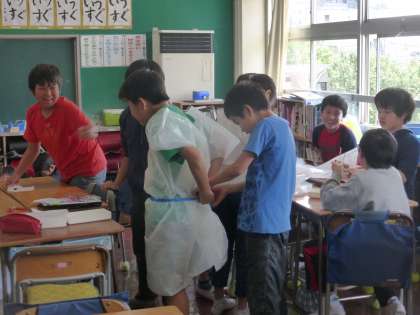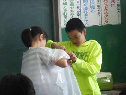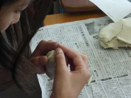 6年生が社会の学習の一環で、貫頭衣づくりと土器づくりをしました。