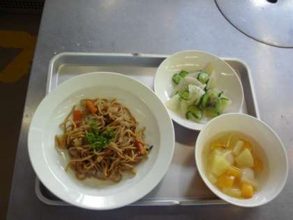 献立名 ソース焼きそば 牛乳 きゅうりと大根のごま風味 フルーツ白玉