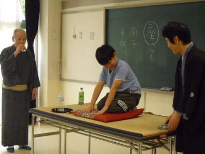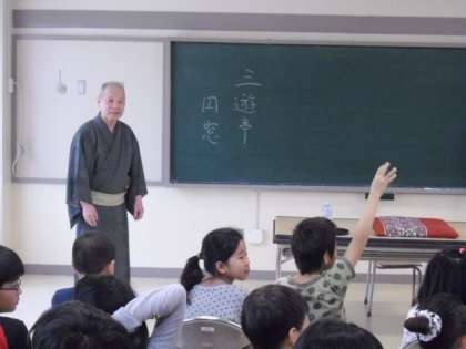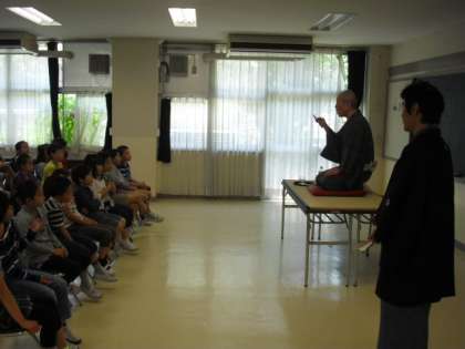 国語の「落語」の単元に関連して、落語家の三遊亭円窓さんと三遊亭窓輝さんをゲストティーチャーにお招きして授業をしていただきました。扇子や手ぬぐいの使い方や、間の取り方を学び、とても楽しく充実した2時間でした。