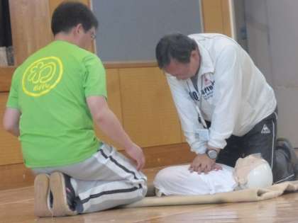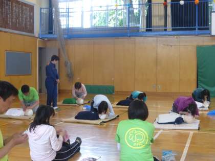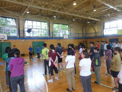 放課後の体育館で、杜の学び舎の小学校の先生たちが集まって、