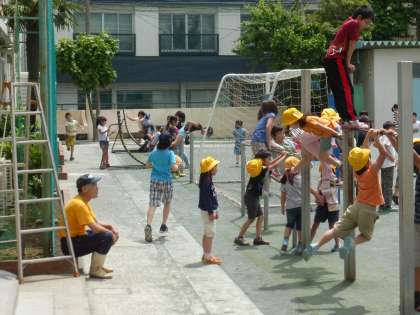 休み時間の校庭では黄色い帽子があちらこちらで見られます。