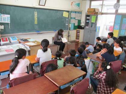 読み聞かせに来ていただいている日は、みんな食い入るように話に聞き入っています。